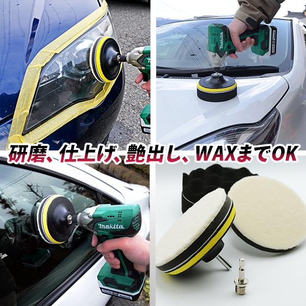 ポリッシャーの特徴 ディスク状のバフを回転させて研磨を行う電動工具です。 自動車の傷取り研磨やワックスの塗布・艶出し によく用いられます。 この他にも、床の研磨や階段・通路の手すりの研磨、鏡の研磨などにも用いられています。 手作業と比べて格段にきれいに、しかも短時間で効率的に作業が行えます。 車の研磨イメージ1 車の研磨イメージ2Pearl's ポリッシャー バフ 125mm 7点セット 六角軸付き インパクトドライバー 電気 電動ドリル用 スポンジ 洗車 車磨き研磨 艶出し 塗装仕上げ 水垢取りに (7点セット)軽量 コンパクト コードレス 洗面台 バイク 車 墓石 ハンディーポリッシャー 電池 コンパウンド 低振動 低騒音 簡単 バフセット ケア 洗車用品 女性 風呂掃除エントリーでポイント最大32倍 電動ポリッシャー p79 魁磨き塾 くるくる磨き丸 プロスタッフ